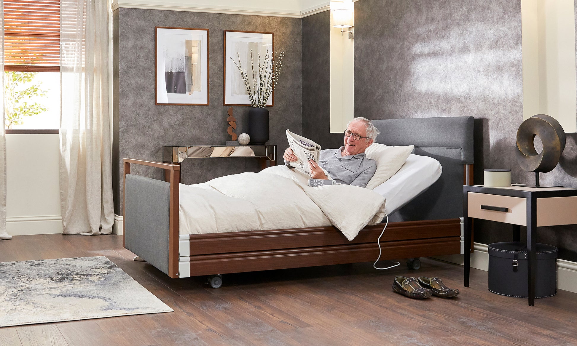 This bed is designed for care at home needs and has all the functionality of a hospital bed but with its included upholstered headboard and footboard, looks at home in your bedroom.